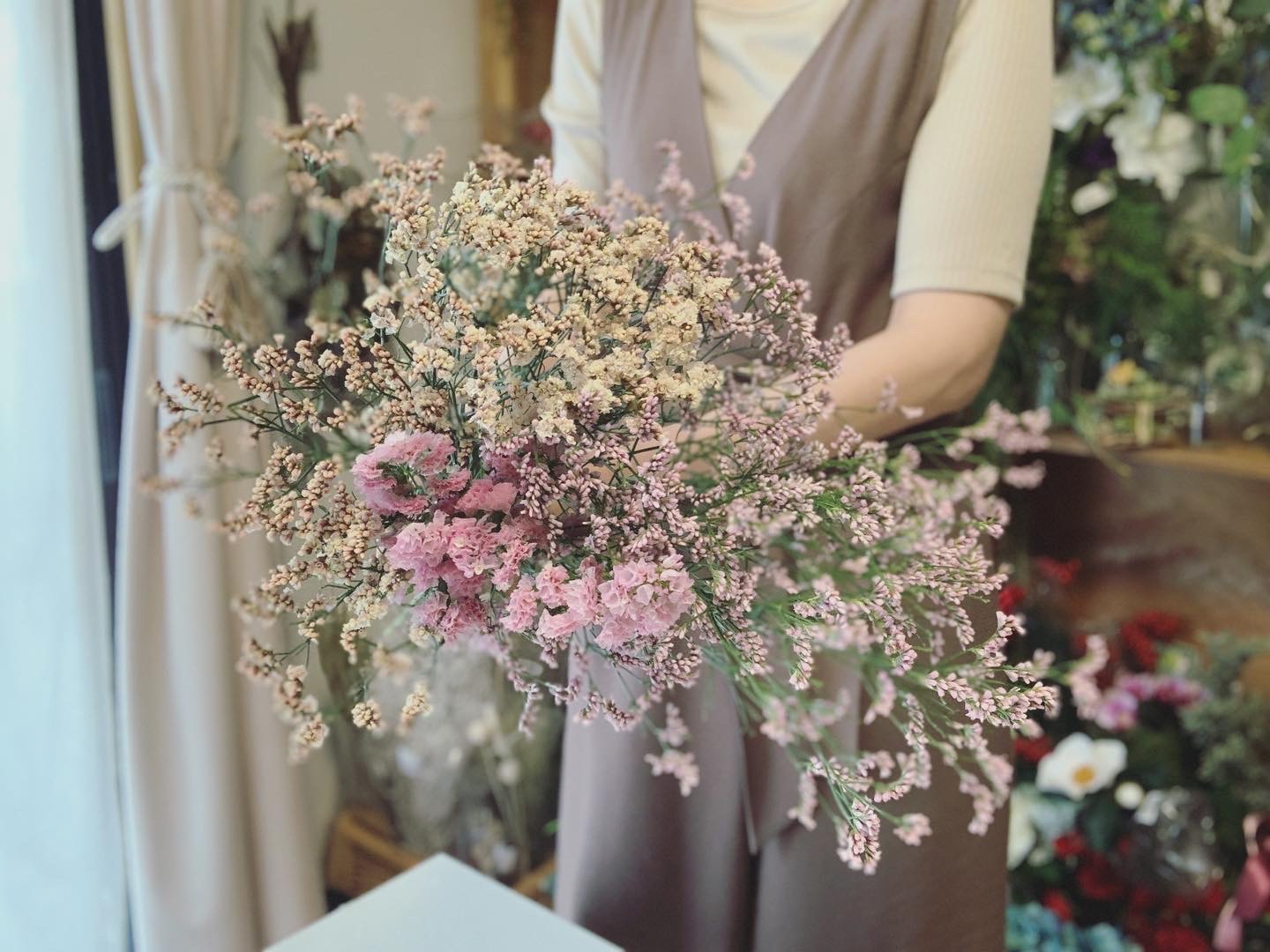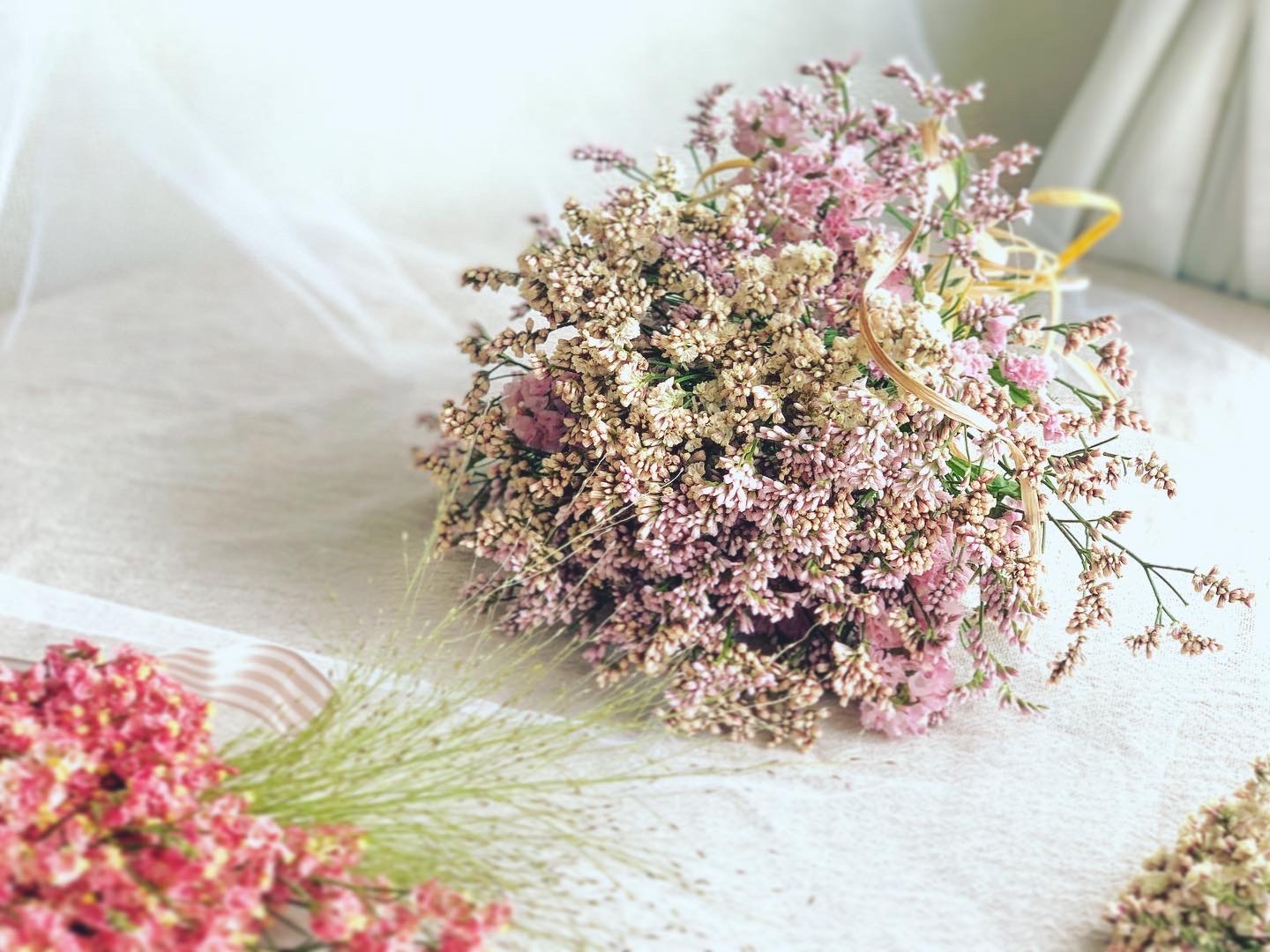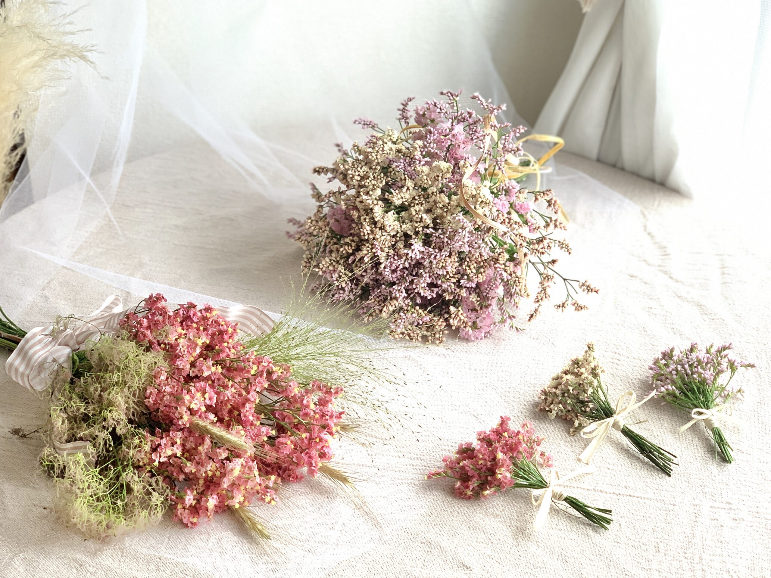 お花はフレッシュまたはハーフドライの状態で制作し、そのあとドライフラワーブーケとして長く楽しんでいただけます。