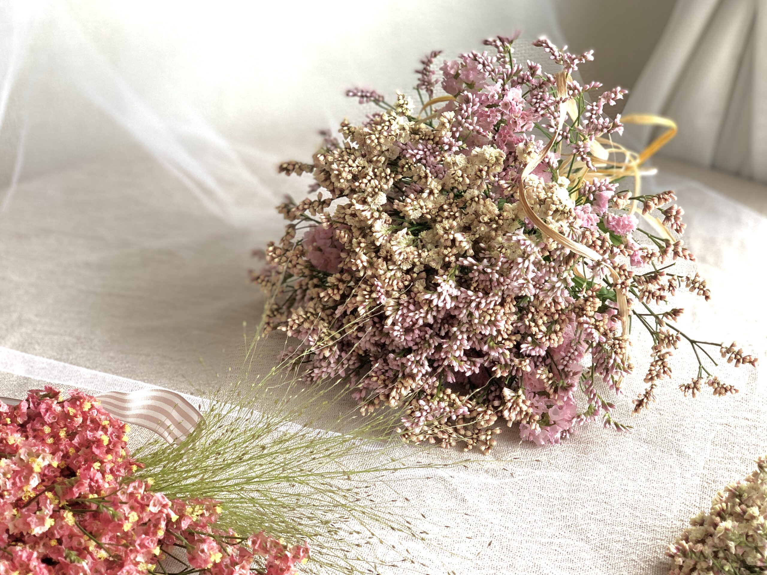 お花はフレッシュまたはハーフドライの状態で制作し、そのあとドライフラワーブーケとして長く楽しんでいただけます。
