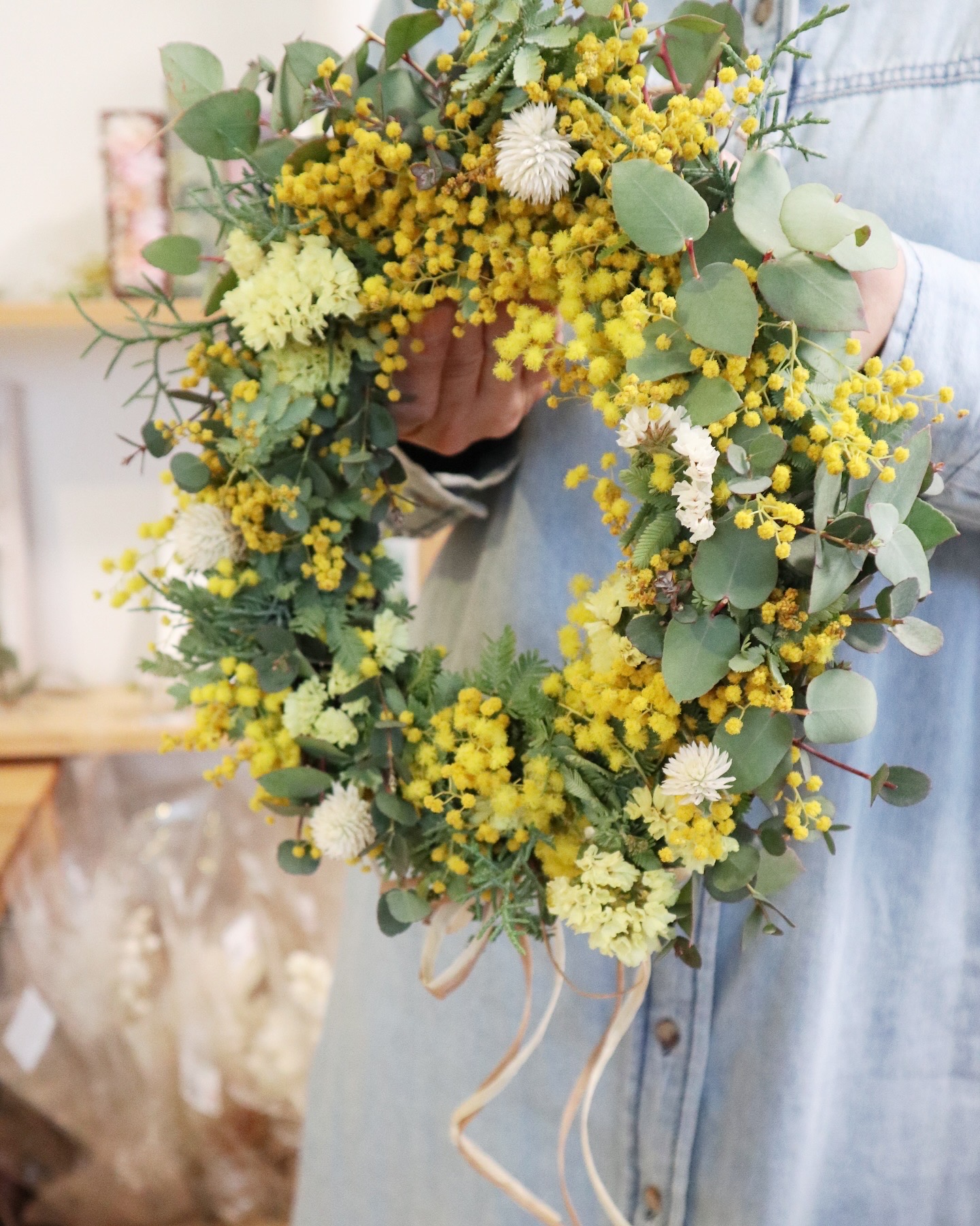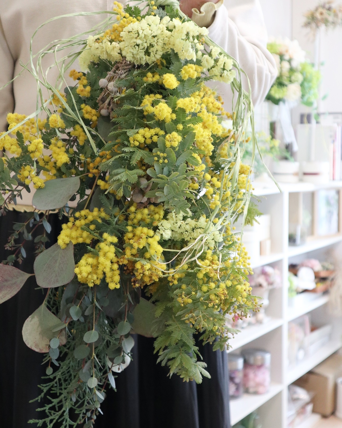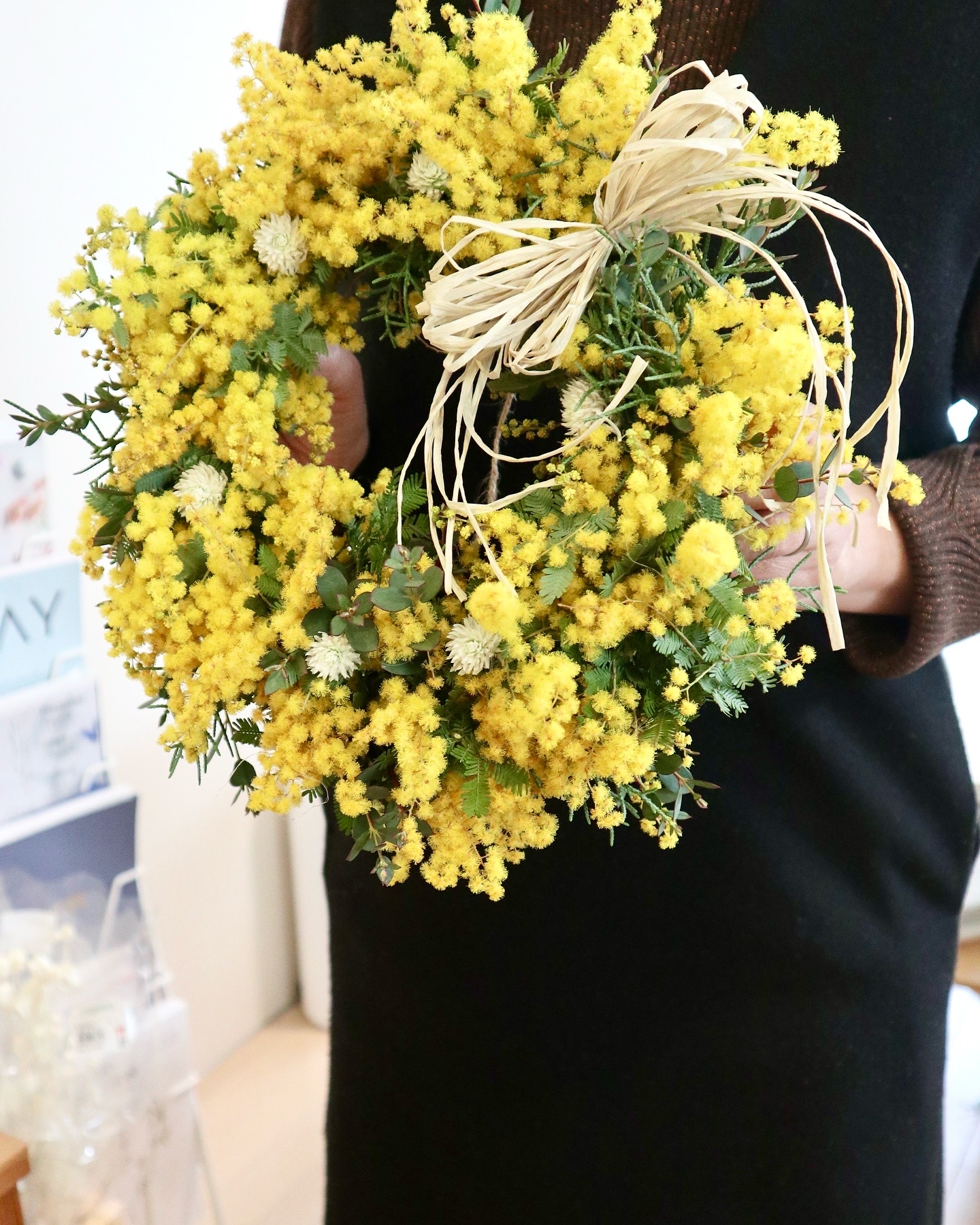 今年は、ミモザをメインにユーカリやスターチスなどナチュラルな花材を組み合わせて今年のバージョンでのご準備となります。